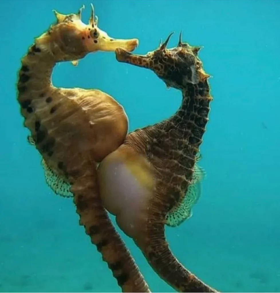 Αναφερόμαστε στην περίπτωση του ιππόκαμπου. Όπως εξηγεί ο βιολόγος Δημήτρης Πάφρας, κατά τη διάρκεια του ερωτικού παιχνιδιού ο θηλυκός ιππόκαμπος μεταφέρει τα αυγά του σε μια ειδική θήκη στην κοιλιά του αρσενικού, όπου γονιμοποιούνται από το σπέρμα του αρσενικού. Στη συνέχεια, ο αρσενικός ιππόκαμπος επωάζει τα γονιμοποιημένα αυγά μέσα στη θήκη του. Τους παρέχει θρεπτικά συστατικά και οξυγόνο κατά τη διάρκεια αυτής της περιόδου κύησης, η οποία συνήθως διαρκεί από μερικές ημέρες έως μερικές εβδομάδες, ανάλογα με το είδος. Όταν τα «μωρά του ιππόκαμπου» είναι πλήρως ανεπτυγμένα, το αρσενικό περνά από μια διαδικασία που ονομάζεται «τοκετός», όπου οι μικροί ιππόκαμποι αφήνονται ελεύθεροι στα νερά της θάλασσας!